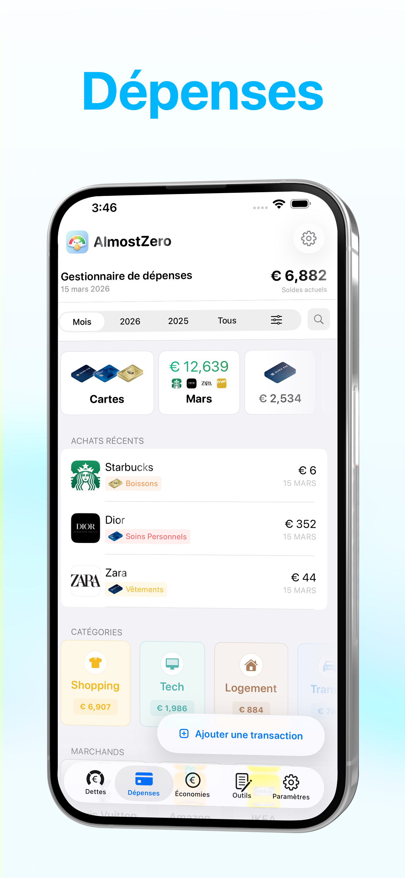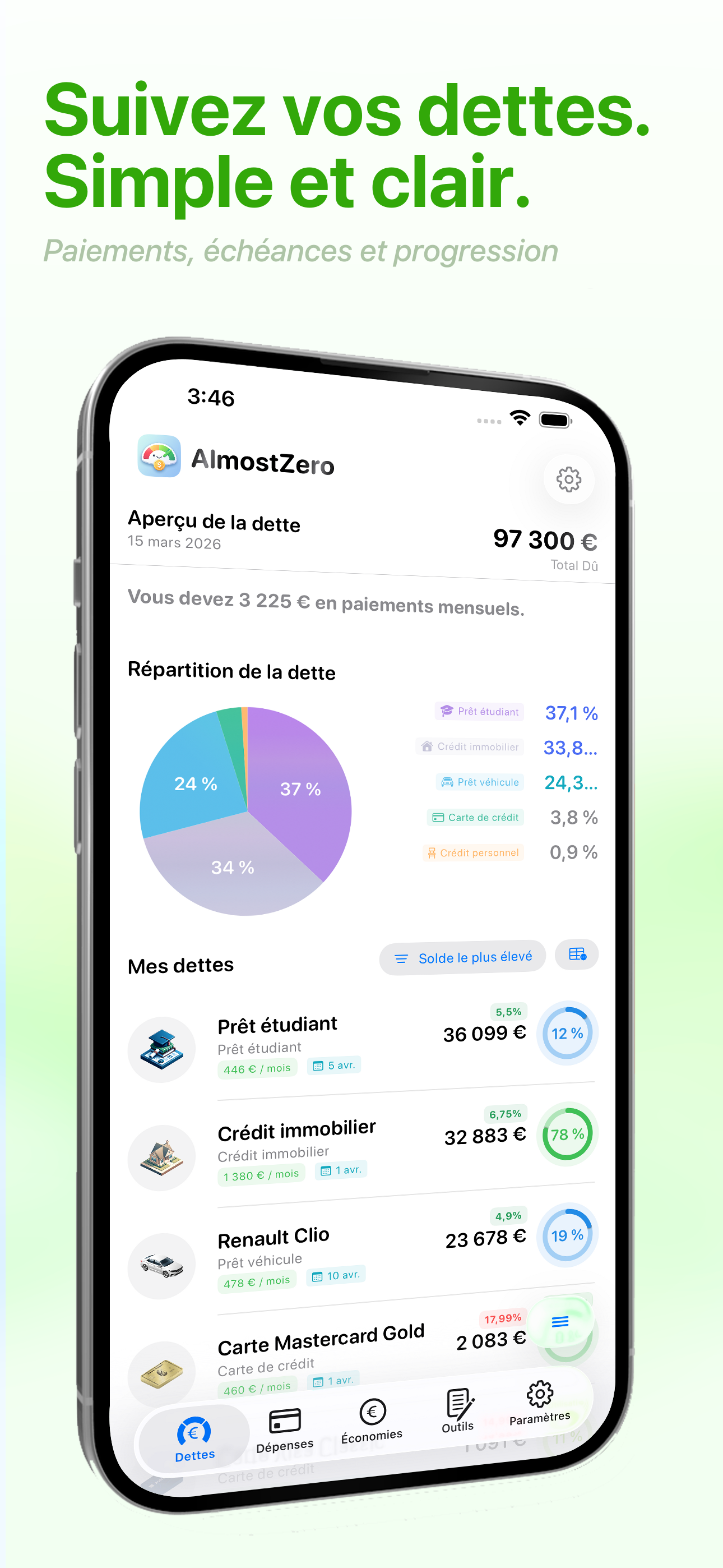 FinanceAlmostZero est une application de finances personnelles qui vous aide à gérer vos dettes, suivre vos dépenses et atteindre vos objectifs d'épargne. Cartes de crédit, prêts étudiants, crédits immobiliers, prêts auto — regroupez toutes vos dettes dans une seule application pour y voir plus clair.