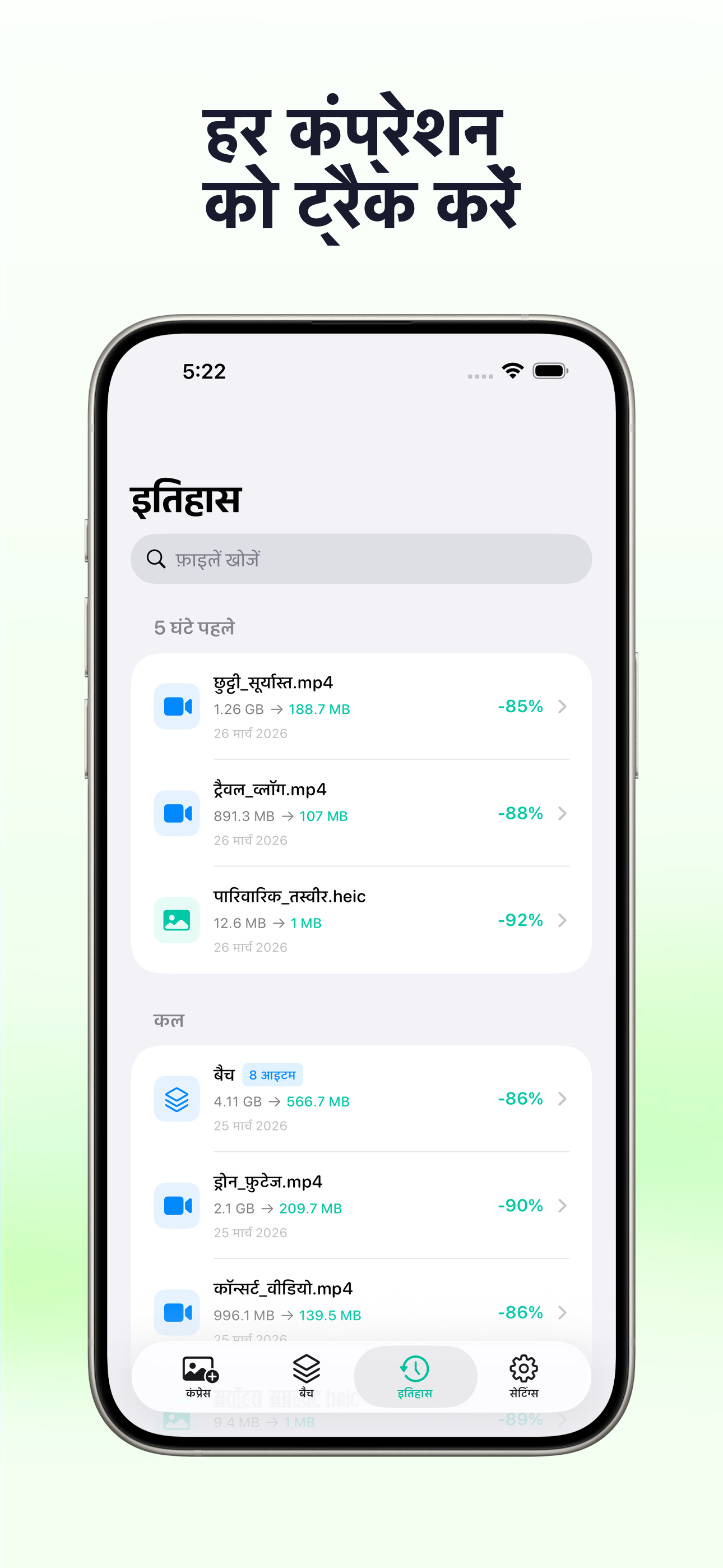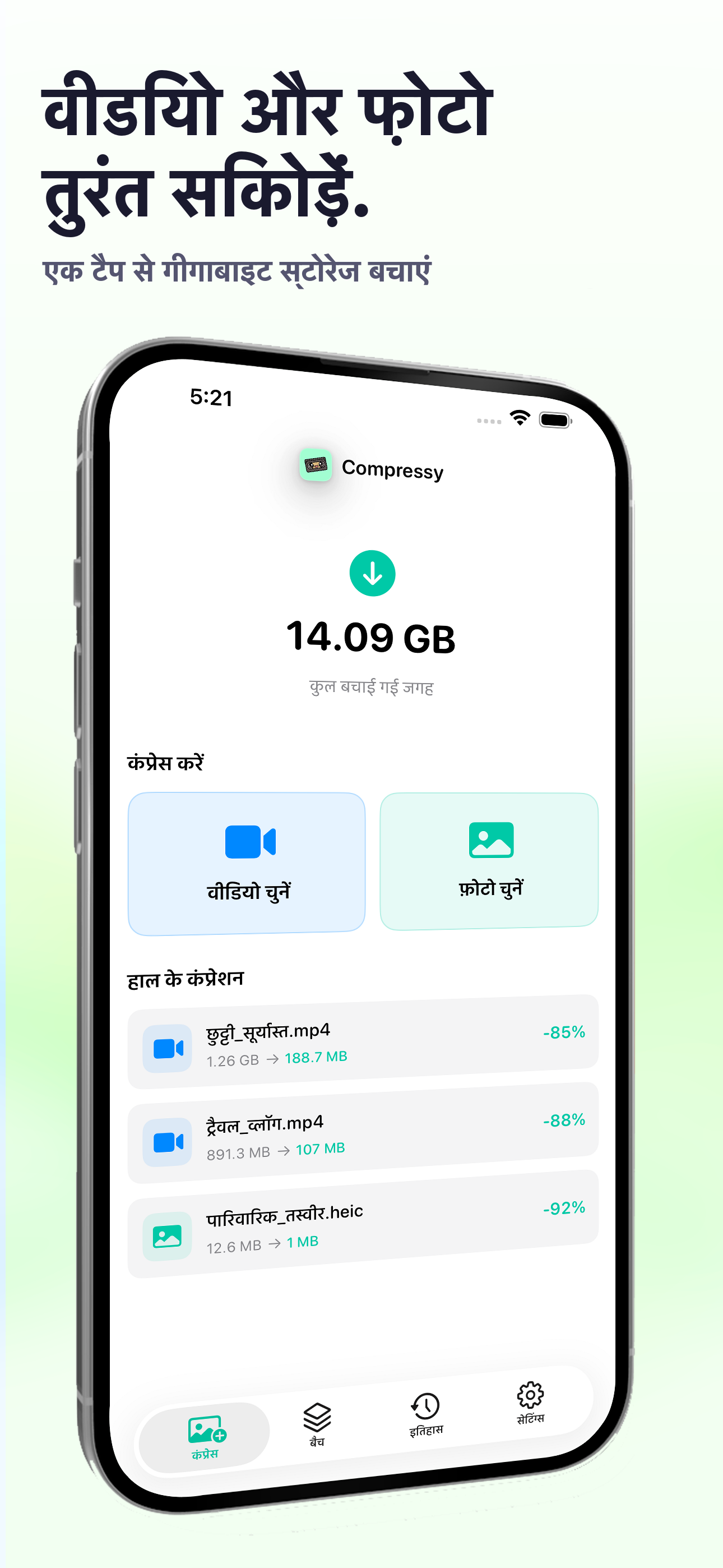 Compressy आपके वीडियो और फोटो को सीधे आपके डिवाइस पर सिकोड़ता है — कोई अपलोड नहीं, कोई अकाउंट नहीं, कोई इंतज़ार नहीं। फाइल चुनें, रीयल-टाइम अनुमान के साथ गुणवत्ता और आकार समायोजित करें और कंप्रेस्ड परिणाम तुरंत शेयर करें।