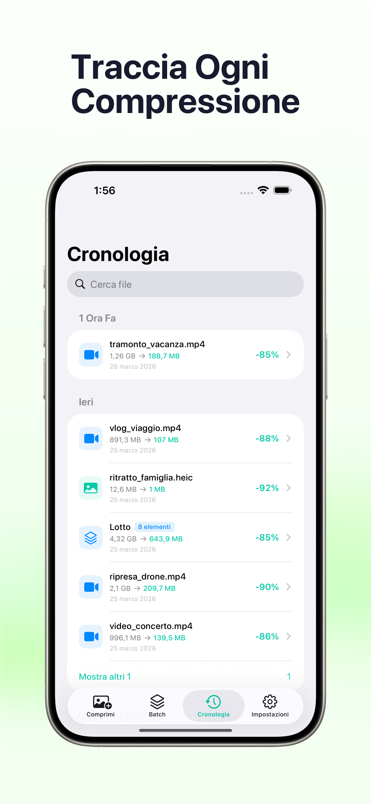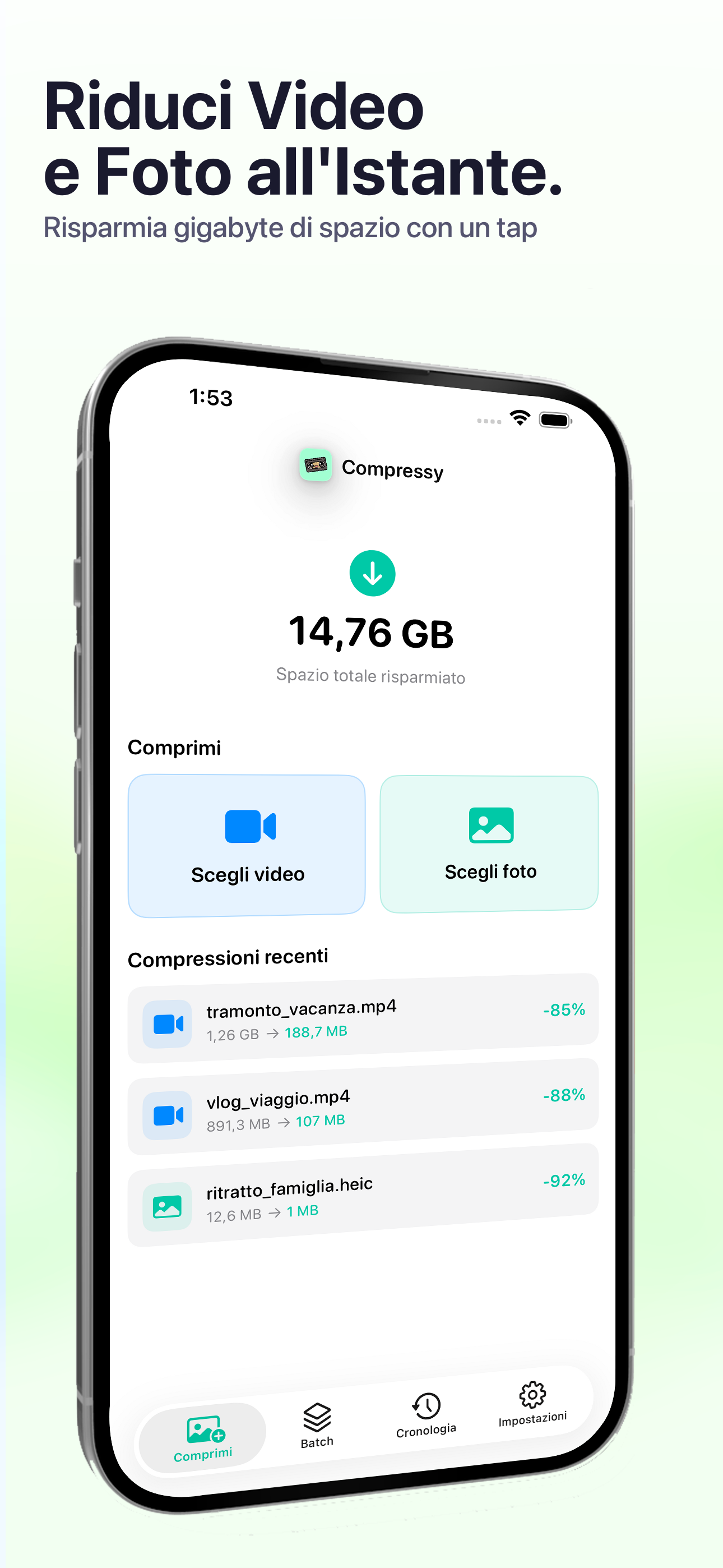 Compressy riduce i tuoi video e le tue foto direttamente sul dispositivo — nessun caricamento, nessun account, nessuna attesa. Scegli un file, regola qualità e dimensioni con stime in tempo reale e condividi il risultato compresso all'istante.