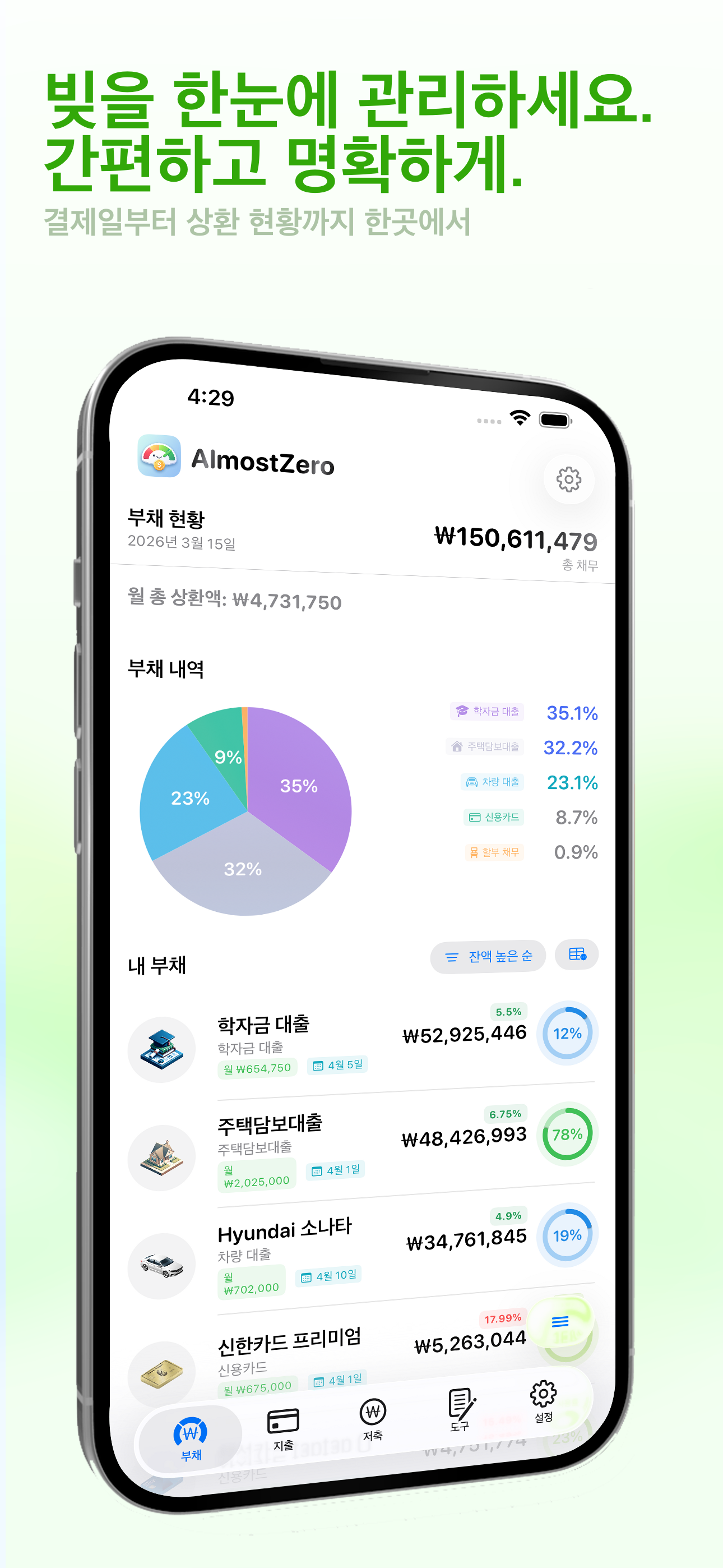 금융AlmostZero는 빚 관리, 지출 기록, 저축 목표 달성을 도와주는 개인 재무 관리 앱입니다. 신용카드, 학자금 대출, 주택담보대출, 자동차 할부 등 다양한 빚을 하나의 앱에서 체계적으로 관리할 수 있습니다.