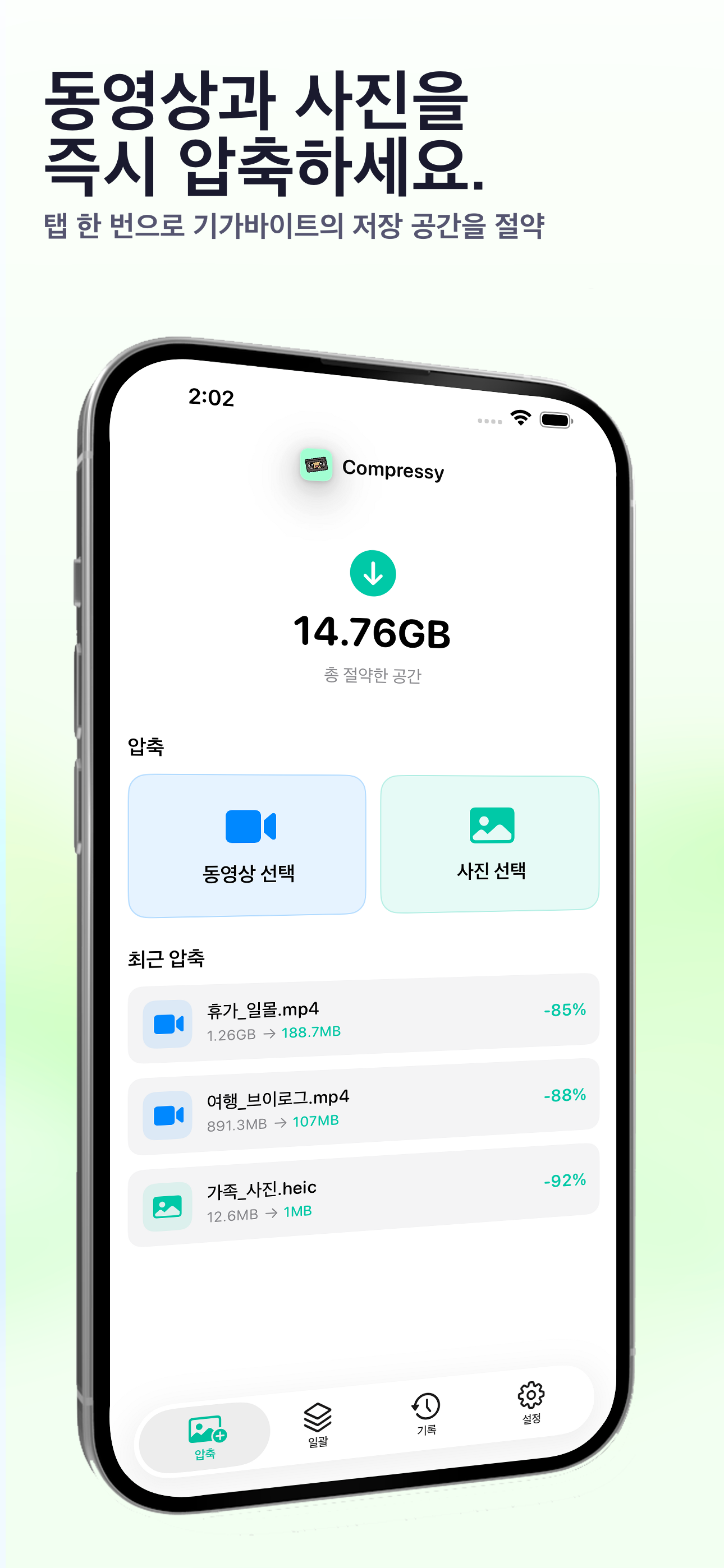 Compressy는 기기에서 직접 동영상과 사진을 줄여줍니다 — 업로드 없이, 계정 없이, 기다림 없이. 파일을 선택하고 실시간 예측으로 품질과 크기를 조정한 후 압축 결과를 즉시 공유하세요.