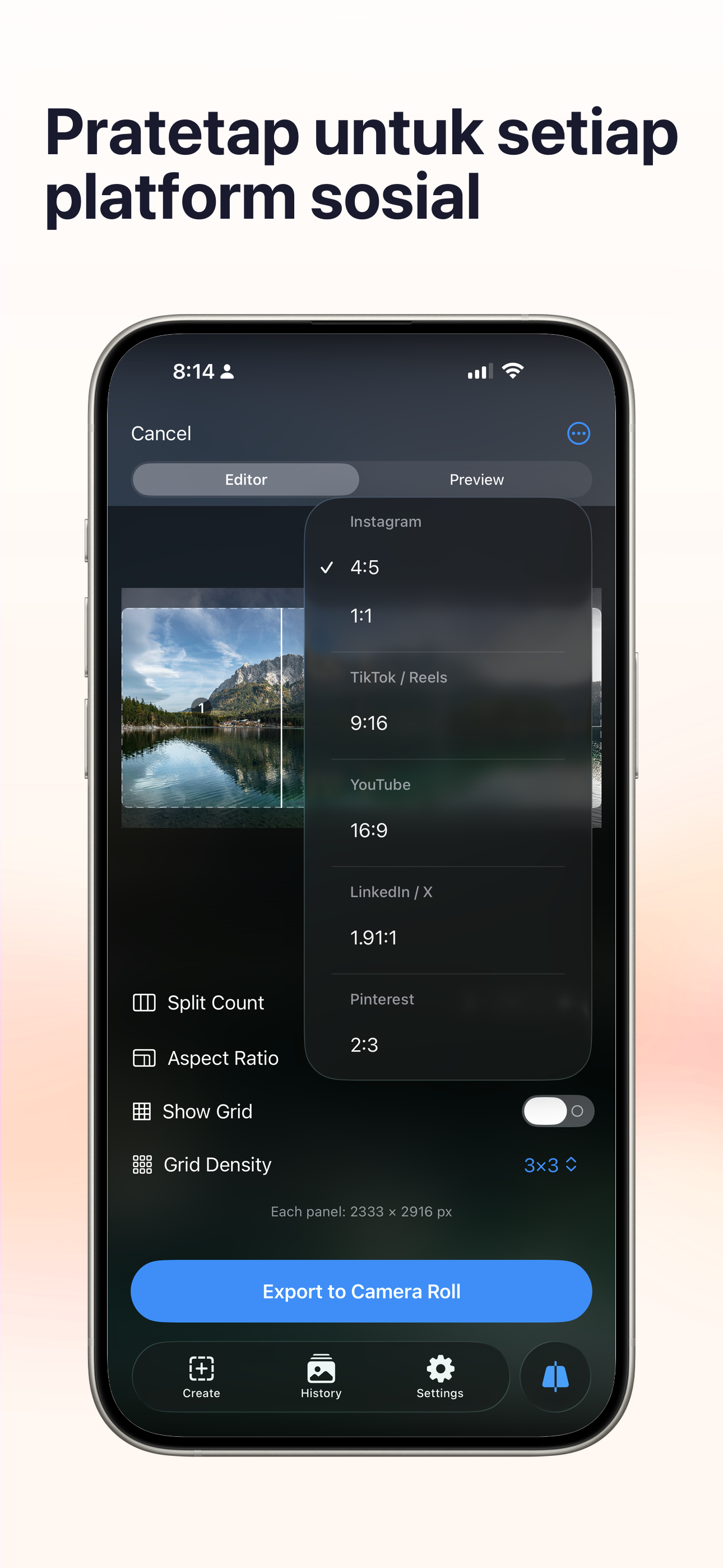Foto & VideoTukar mana-mana panorama kepada karusel Instagram sempurna. Bahagi, pratonton dan eksport — semua dalam satu ketukan.