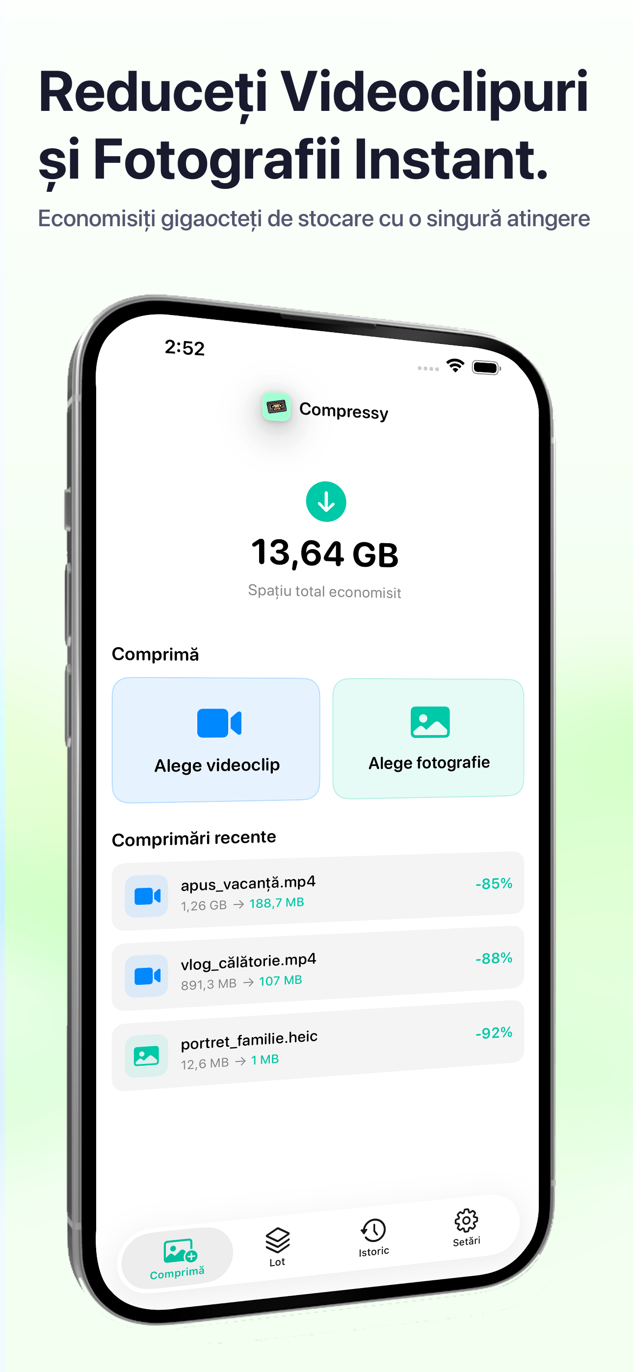 Compressy micșorează videoclipurile și fotografiile direct pe dispozitivul tău — fără încărcări, fără conturi, fără așteptare. Alege un fișier, ajustează calitatea și dimensiunea cu estimări în timp real și partajează rezultatul comprimat instantaneu.