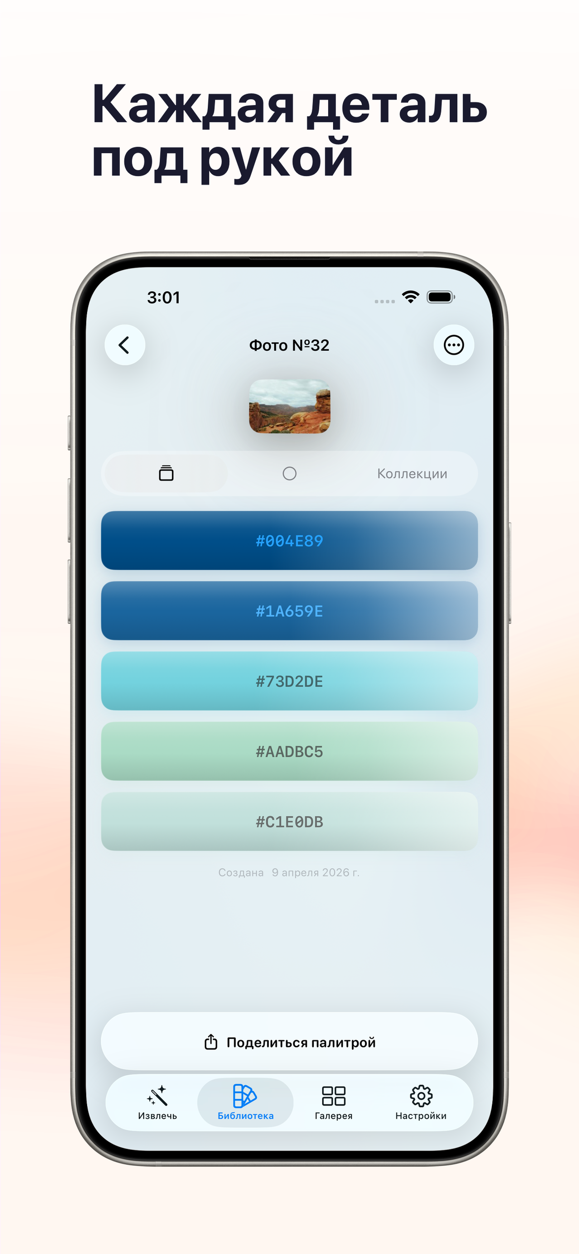 Turn any photo into a stunning color palette — instantly, on-device. Save, organize, and share with HEX, RGB & HSL codes.