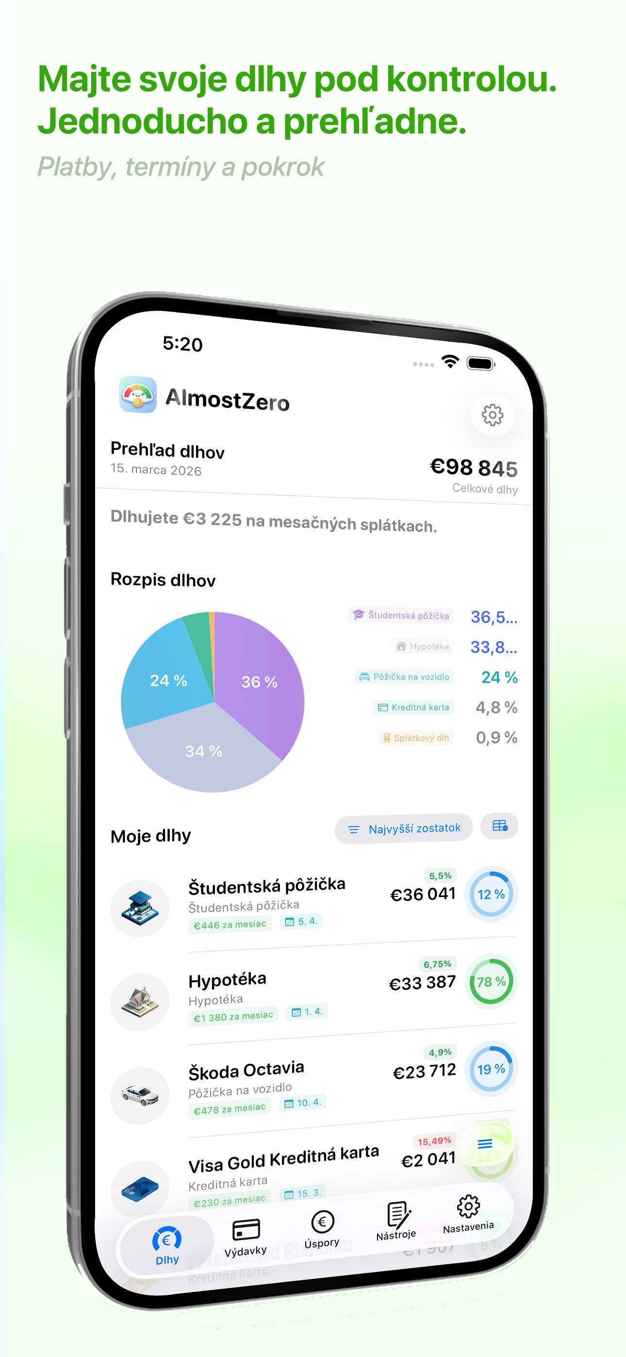 AlmostZero je výkonná aplikácia na správu osobných financií, ktorá vám pomôže sledovať dlhy, spravovať výdavky a dosiahnuť vaše úsporné ciele. Či už splácate kreditné karty, študentské pôžičky, hypotéku alebo pôžičku na auto, AlmostZero vám poskytne jasný prehľad o vašej finančnej situácii a povedie vás krok za krokom k finančnej slobode.