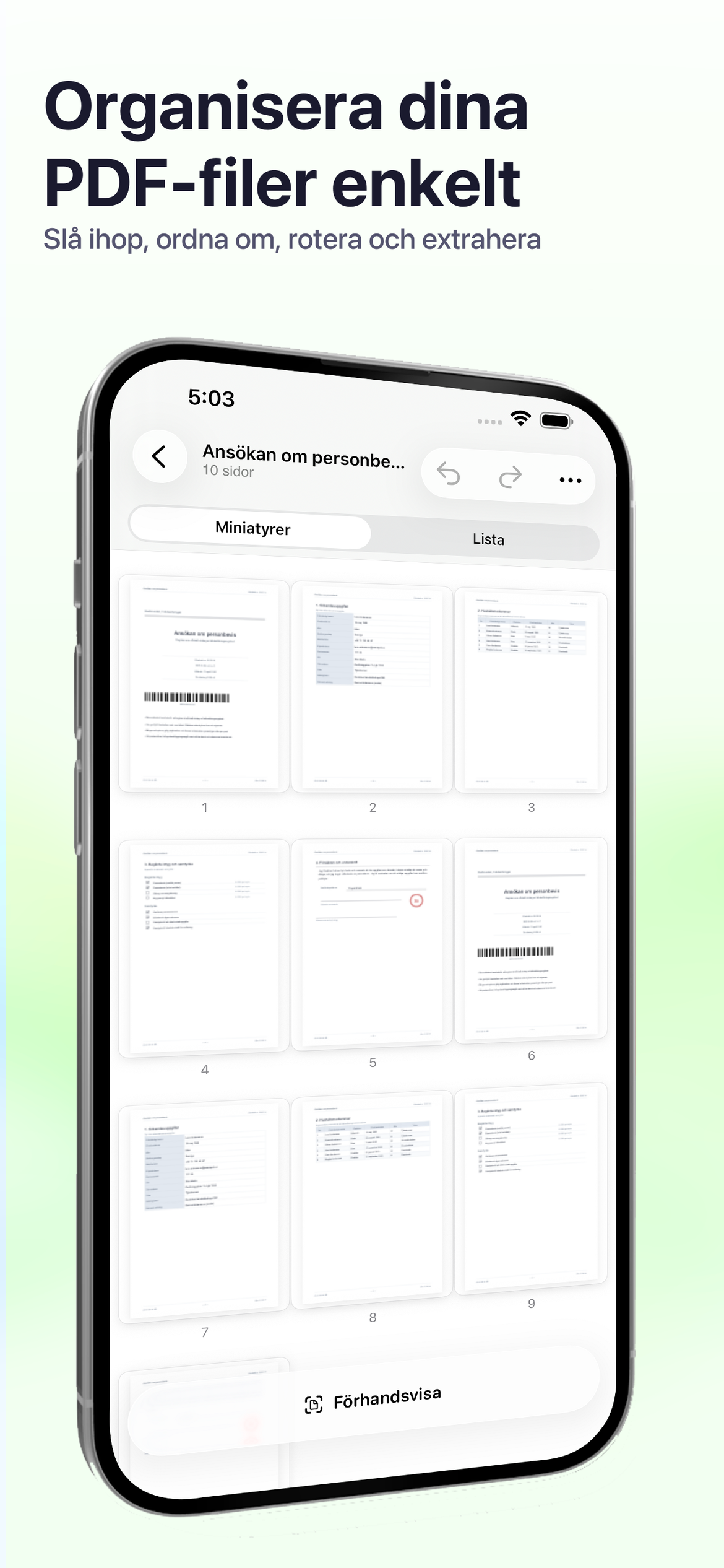 Drag to reorder pages. Merge PDFs into one. Rotate, extract, and delete pages. Everything happens on your iPhone — nothing is ever uploaded.