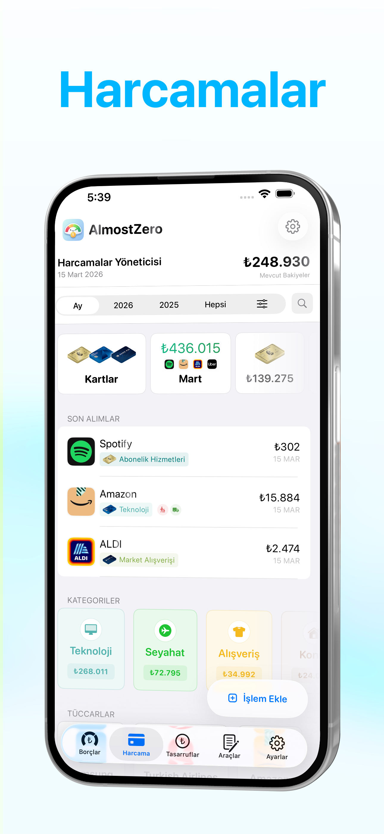 AlmostZero, borçlarınızı yönetmenize, harcamalarınızı takip etmenize ve tasarruf hedeflerinize ulaşmanıza yardımcı olan kişisel finans uygulamasıdır. Kredi kartları, öğrenci kredileri, konut kredileri, taşıt kredileri — tüm borçlarınızı tek bir uygulamada toplayarak finansal durumunuzu net bir şekilde görebilirsiniz.