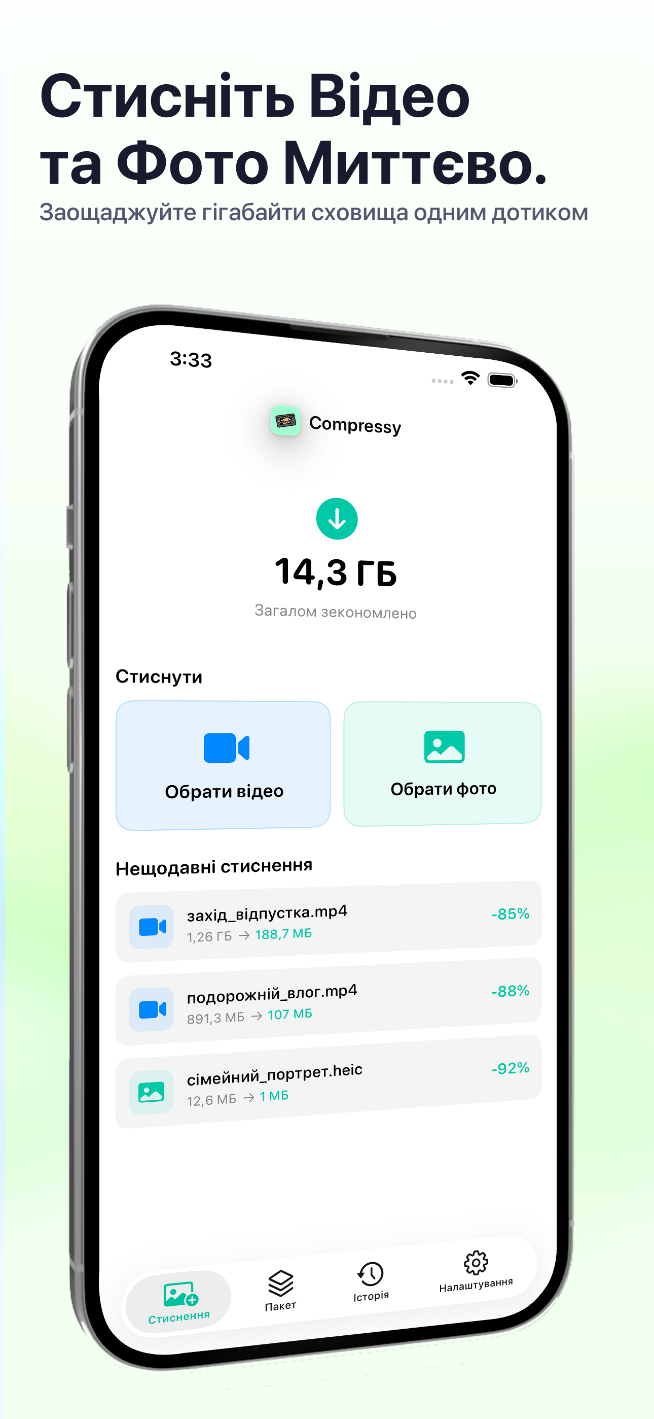 Compressy стискає ваші відео та фото прямо на пристрої — без завантажень, без облікових записів, без очікування. Виберіть файл, налаштуйте якість і розмір з оцінками в реальному часі та миттєво поділіться стиснутим результатом.