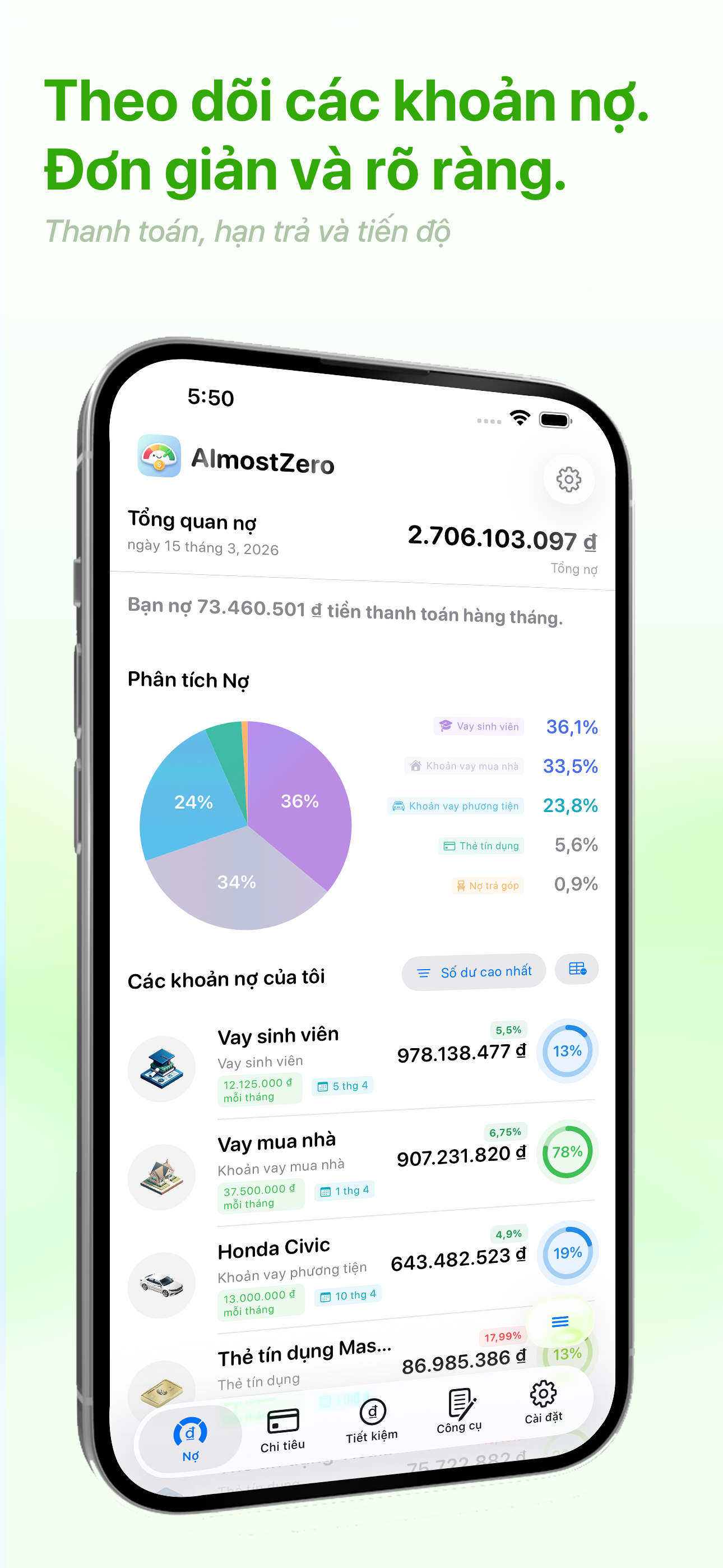 AlmostZero là ứng dụng quản lý tài chính cá nhân mạnh mẽ, được thiết kế để giúp bạn theo dõi nợ, quản lý chi tiêu và đạt được mục tiêu tiết kiệm. Dù bạn đang trả nợ thẻ tín dụng, vay sinh viên, vay mua nhà hay vay mua xe, AlmostZero cung cấp bức tranh rõ ràng về tình hình tài chính của bạn và hướng dẫn bạn từng bước hướng tới tự do tài chính.